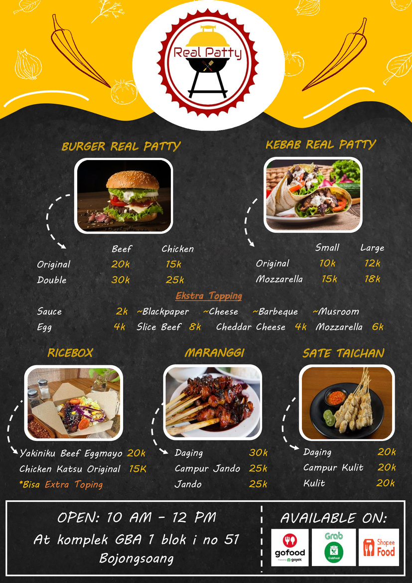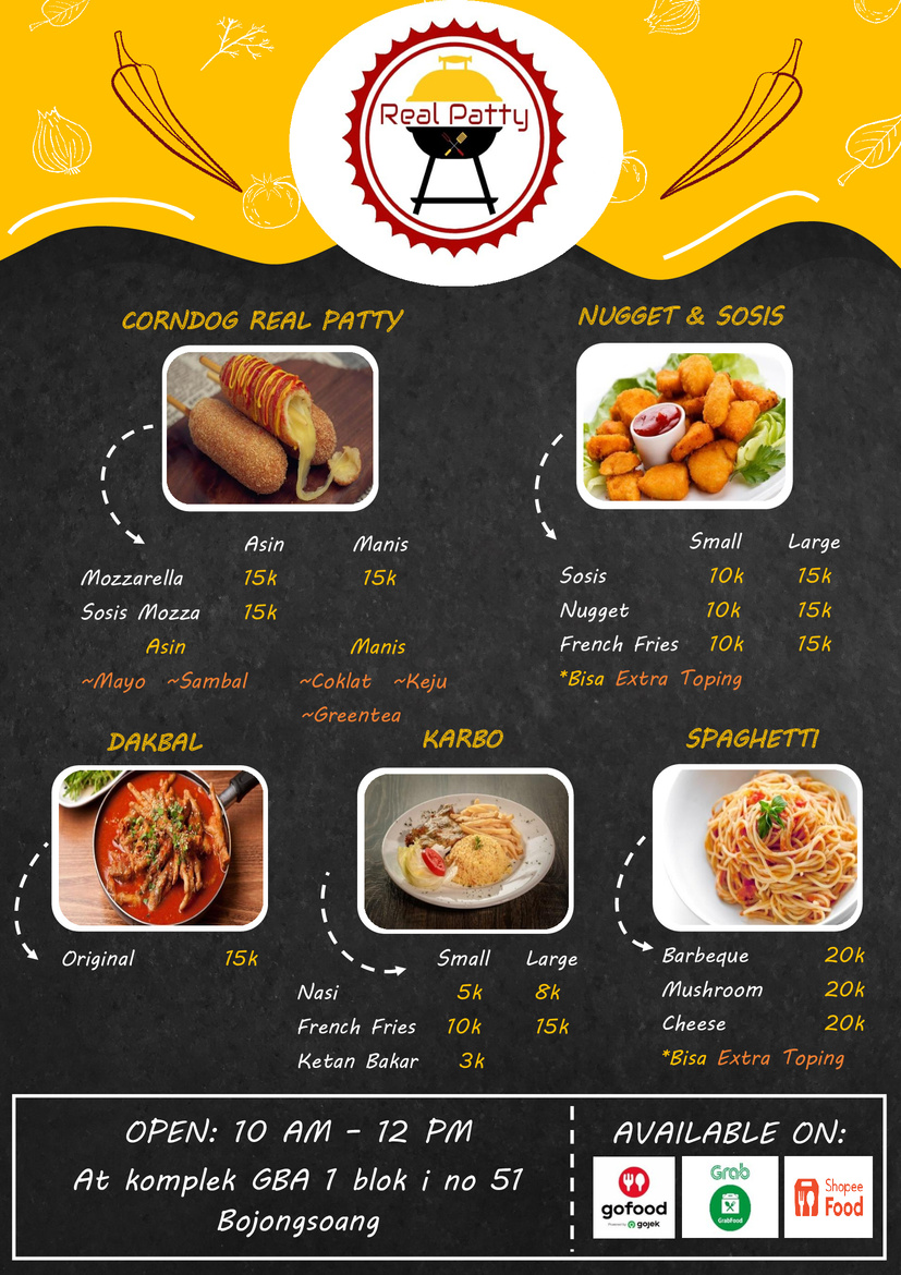 Real Patty merupakan produk yang dihasilkan oleh Usaha Mikro, Kecil, dan Menengah (UMKM) yang terletak di Bojongsoang, Kabupaten Bandung, Jawa barat